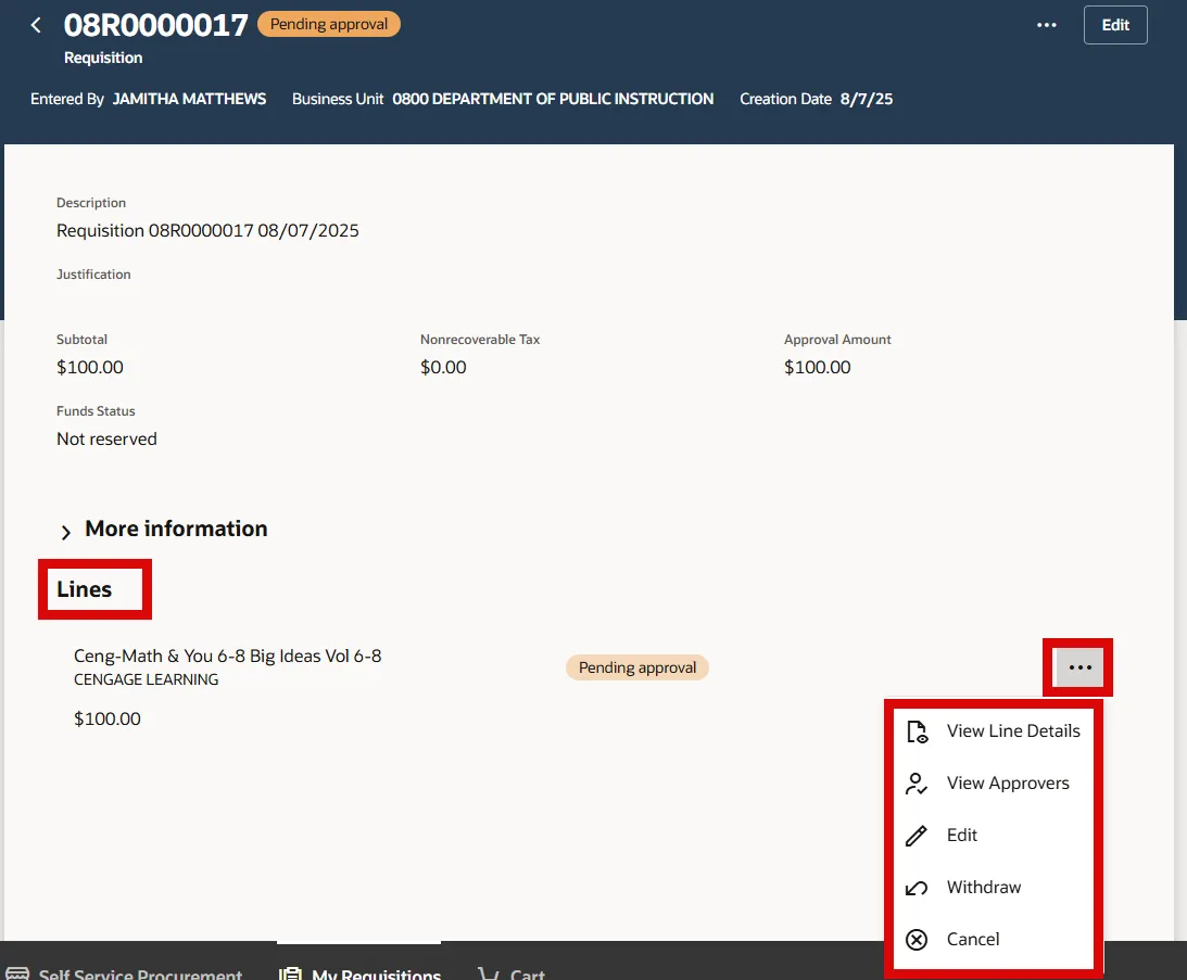 Step 36. Under the Lines section, select the Actions (…) to View Approvers.