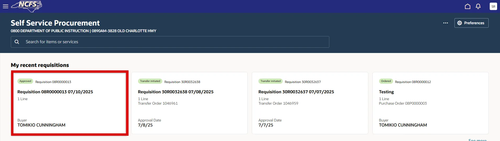 Step 4. On the Preferences page, enter the 0800 Department of Public Instruction in the Requisition BU field.