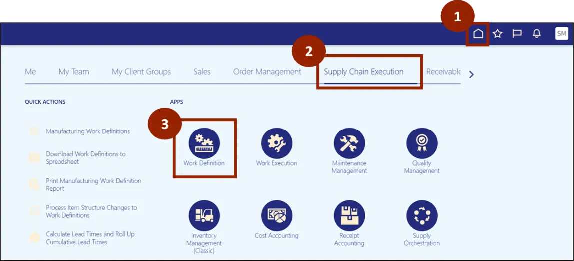 Stpe 3. Within the Supply Chain Execution tab, select Work Definition.