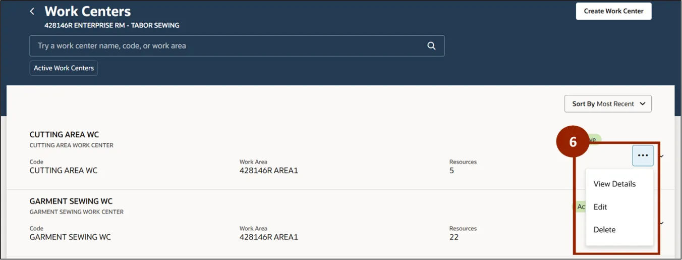 Step 6. On the Work Centers page, select the ellipsis icon then select: