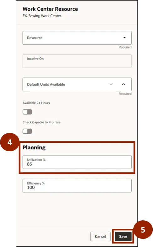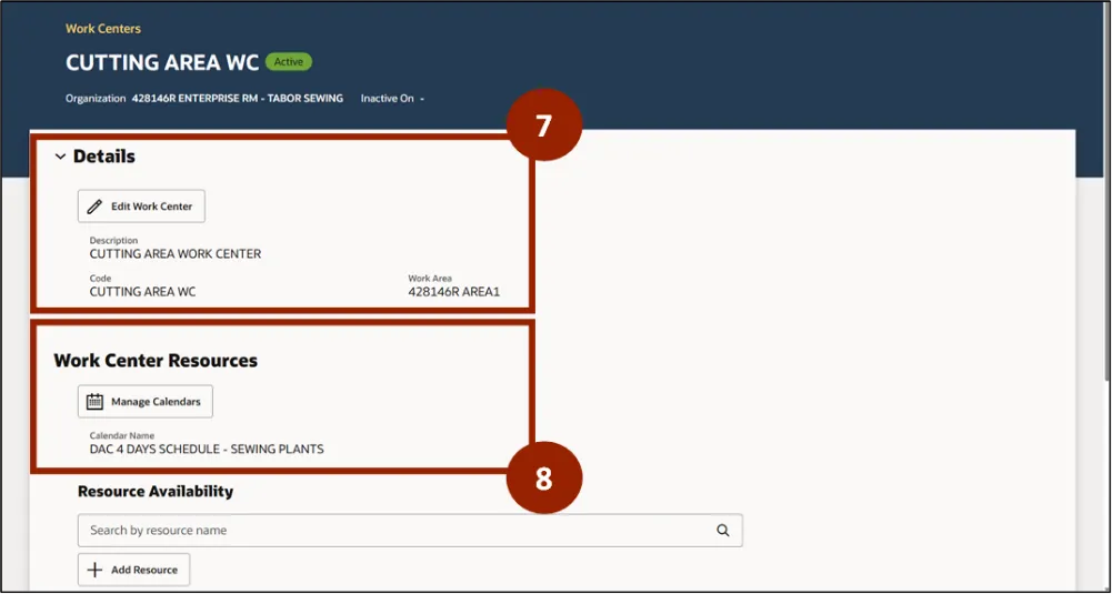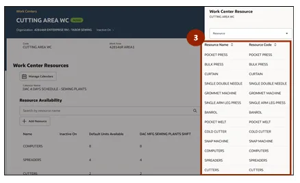 Step 9. Review the Resource Availability section displaying the number of available resources in the Work Center and the default units for each resource.