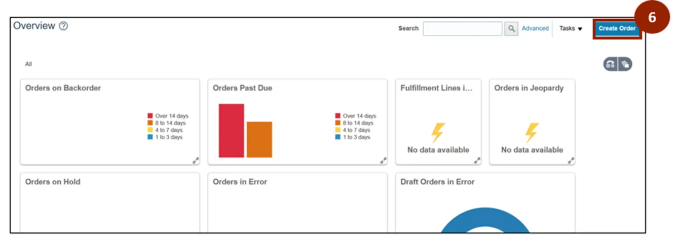 Note: The Order Management Overview screen displays information visually, providing data for DAC. As orders are created and progress, the diagrams and values will populate on this screen. If it is a new instance, this screen displays with minimal information.