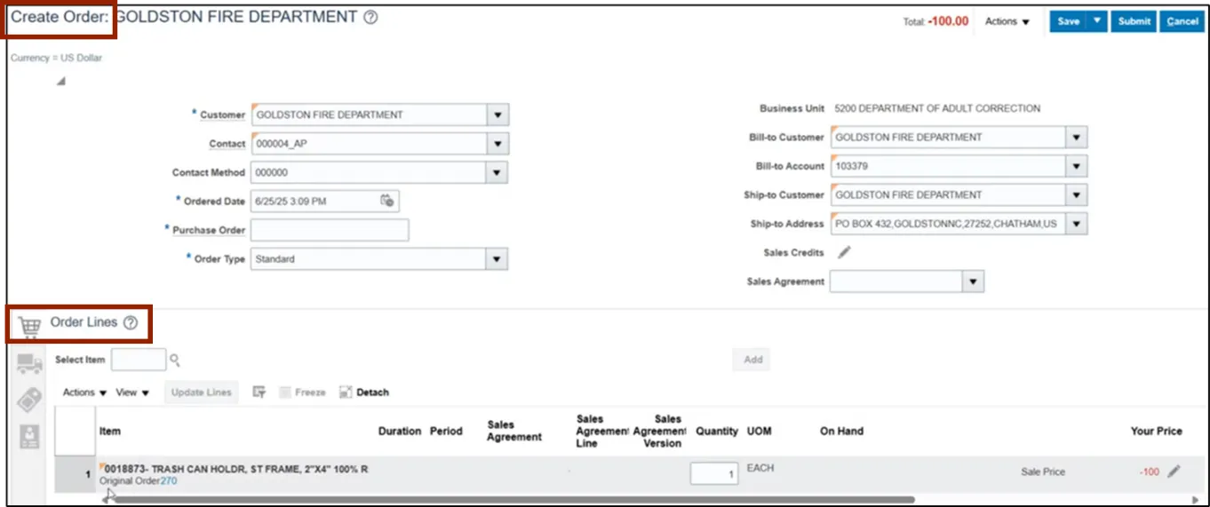 Step 7. In the Create Order screen, enter the required header information and navigate to the Order Lines section and add a new line item.