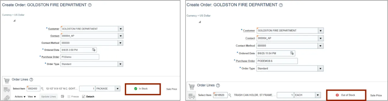 Note: Once the line is added, the system displays whether the item is in stock or out of stock. If the item is out of stock, it must be manufactured at the assigned plant. Once a line is added within the Order Lines, NCFS displays the on-hand availability of the item.