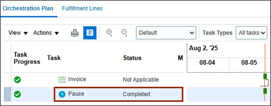 Note: Once the pause task has been completed, the Orchestration Plan tab’s Status column displays the status of the pause as Completed.