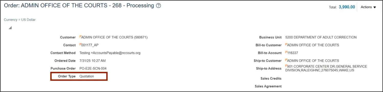Once you are on the Create Order screen, the process for creating a quotation follows the same consistent approach used for other order types. The screen layout, header fields, and tabs remain the same. The Primary distinction is in the Order Type field, which in this case is set to Quotation.