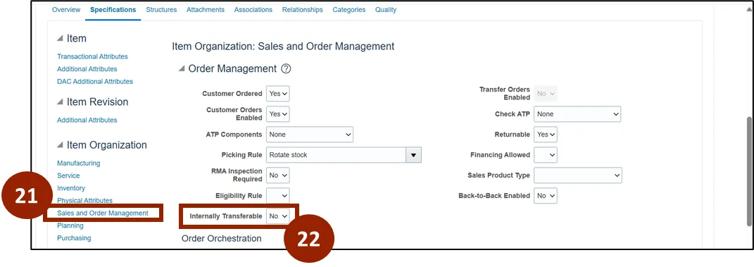 Step 21. Within the Item Organization section, select the Sales and Order Management link.