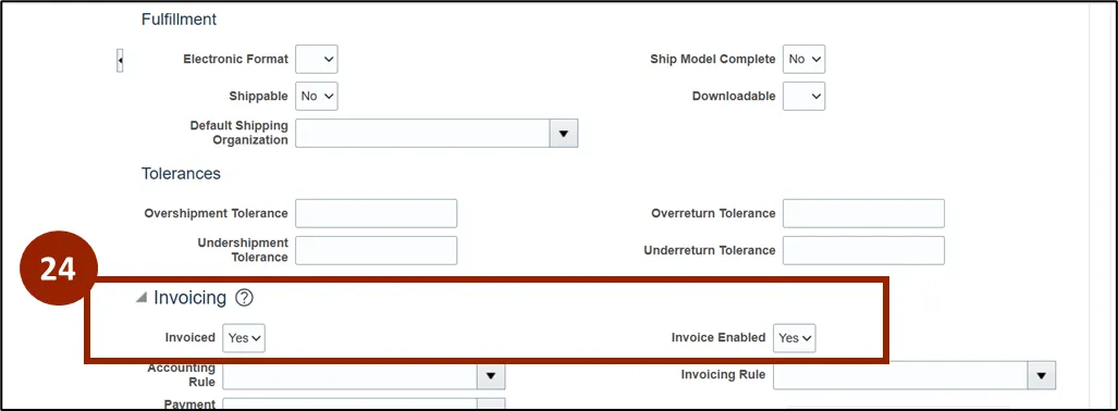 Step 24. Scroll down to the Invoicing section. Confirm that both the Invoiced and Invoice Enabled drop-down values are set to Yes.