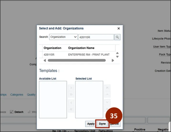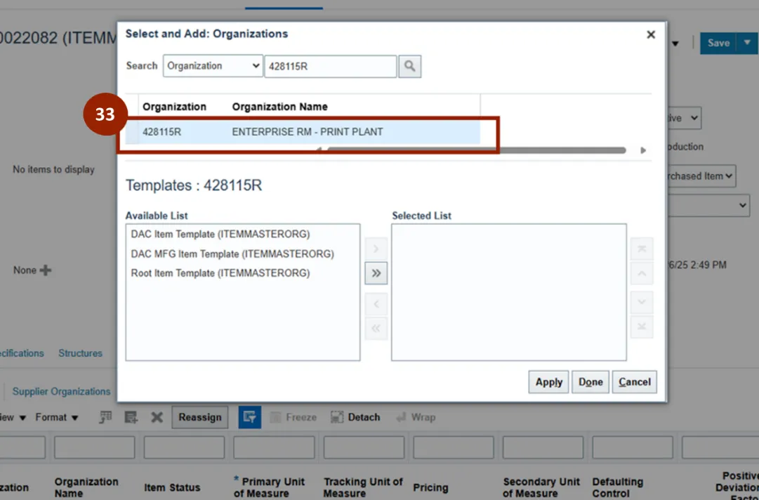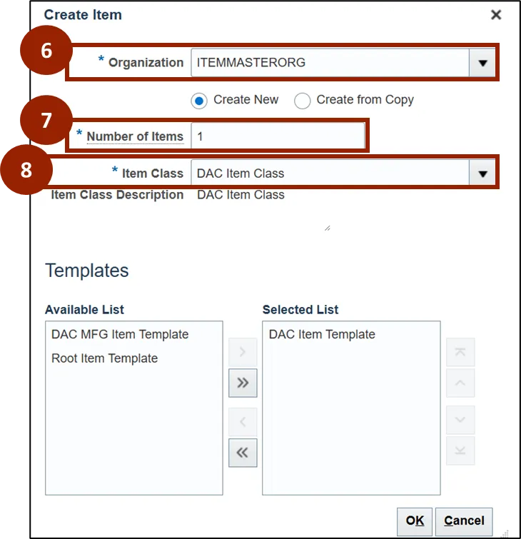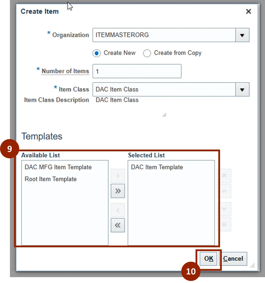 Step 9. Within the Templates section, the Available List displays a list of templates available to apply. The Selected List displays the template selected for this item, defaulted to display DAC Item Template.