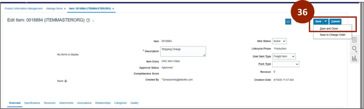 Step 36. Navigate back to the top of the Create Item page. From the Save drop-down, select Save and Close.