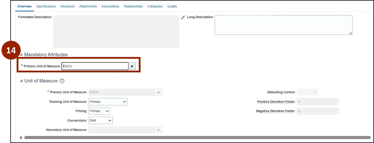 Step 14. On the Create Item page, in the Primary Unit of Measure field within the Mandatory Attributes section, type EACH.