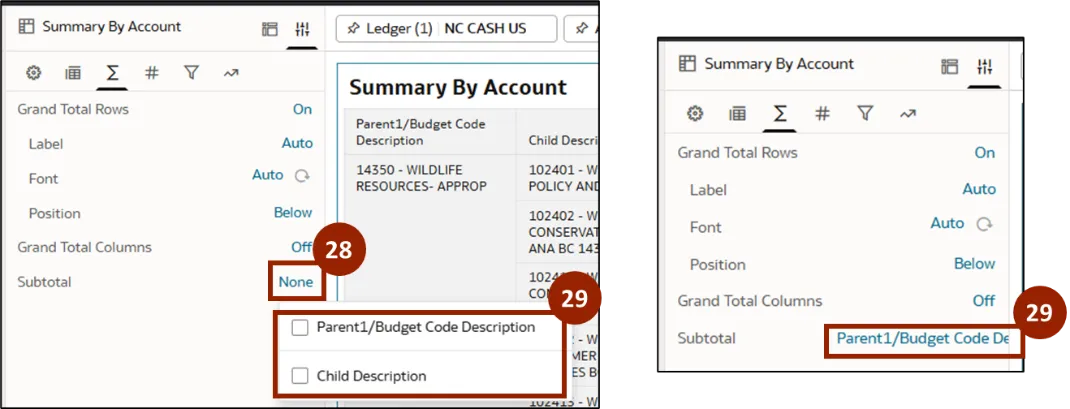 Step 23. Drop Parent1/Budget Code Description into the Rows section. Position it either above or below the existing row fields, as required by the user’s reporting needs.