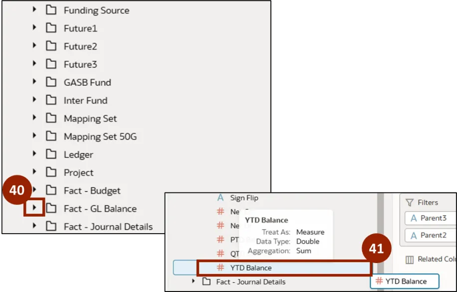 Step 40. Once the report is updated, click the Caret icon next to Fact – GL Balance from the Subject Area.