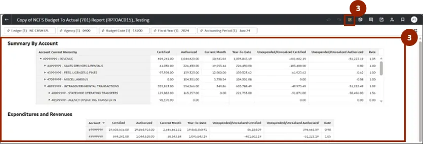 Step 15. Once the report is automatically updated, click the Caret icon next to 59999999 -EXPENDITURES to drill down and reveal further child accounts.