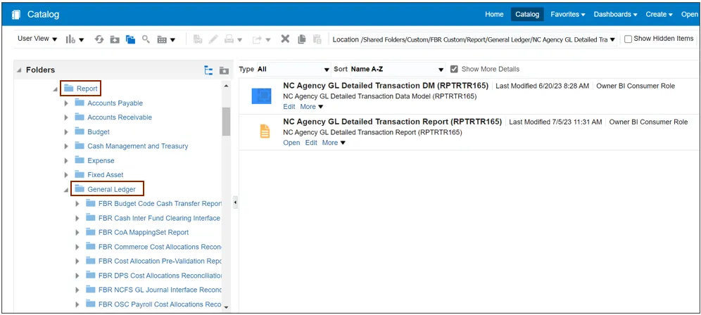 Step 4. The Catalog window appears. Click the Shared Folder>Custom>FBR Custom> Report folder and click on the General Ledger tab under the Report tab.