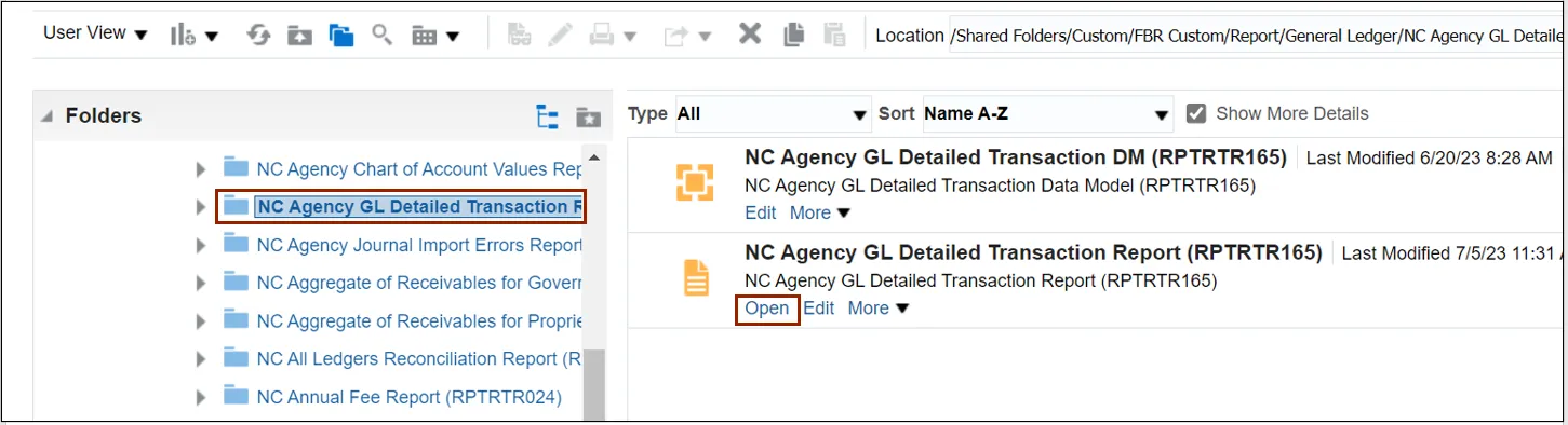 Step 5. Under the General Ledger tab, click the NC Agency GL Detailed Transaction Report (RPTRTR-165). Click the Open button.