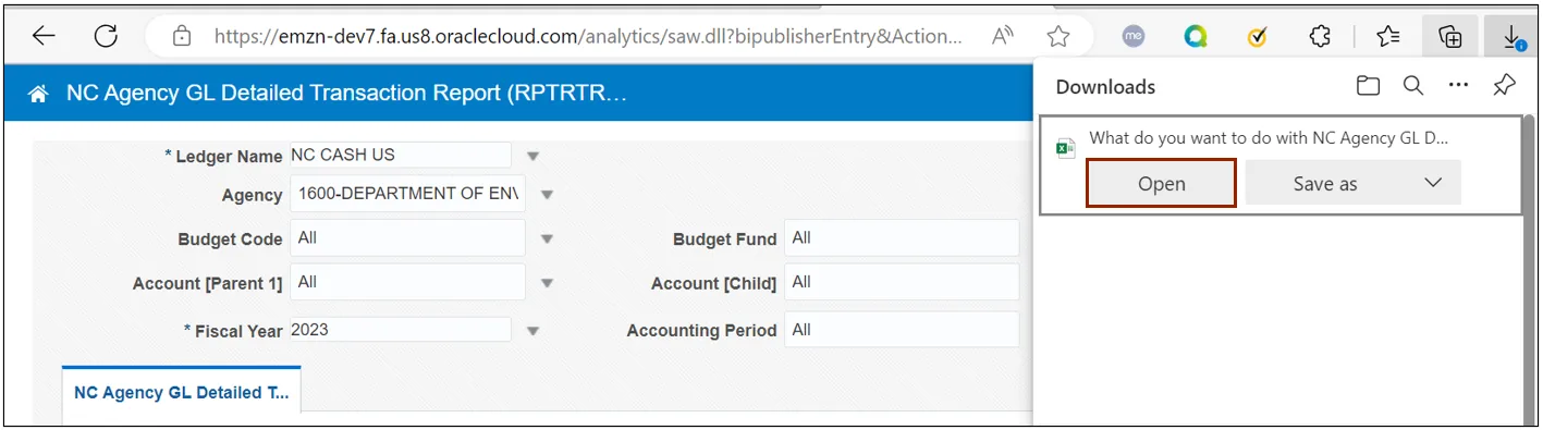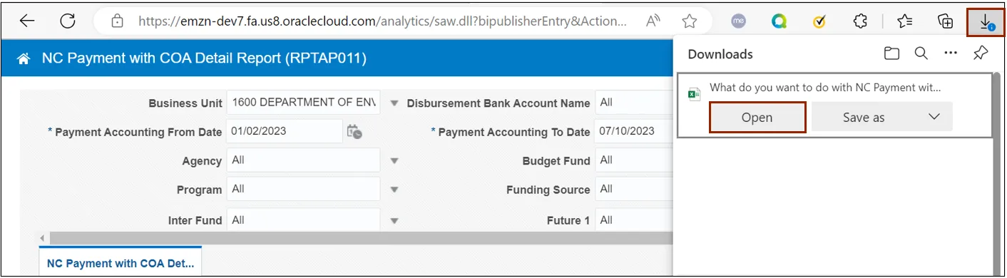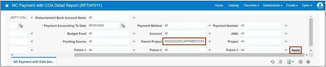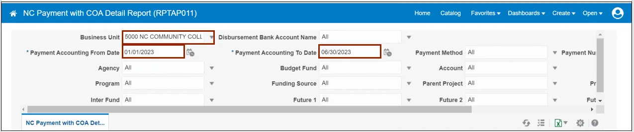 Use the steps above to run NC Payment with COA Detail Report and NC Agency GL Transaction Detailed Report are Oracle custom pre-built reports that use chart of account segments and data ranges as parameters to provide a list of all transactions.