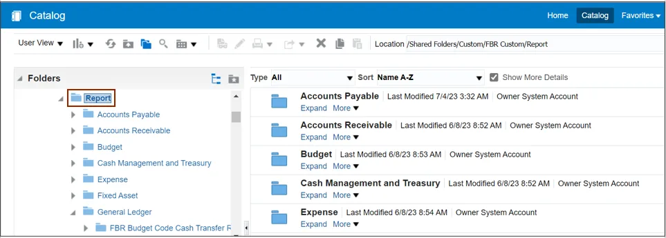 Step 4. The Catalog window appears. Click the Shared Folder>Custom>FBR Custom> Report folder.