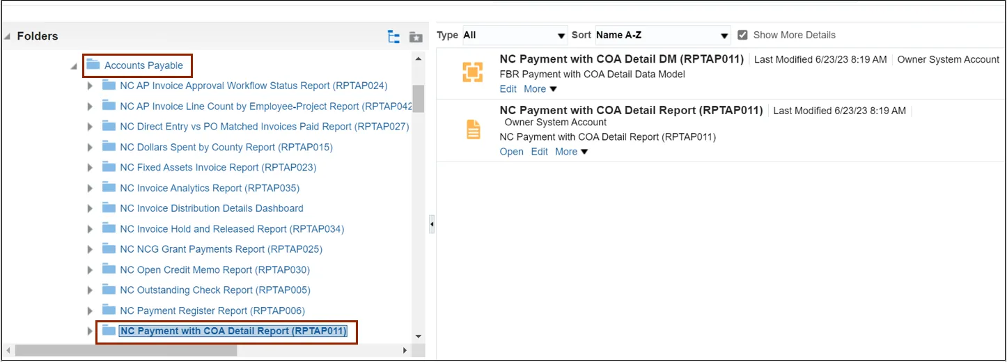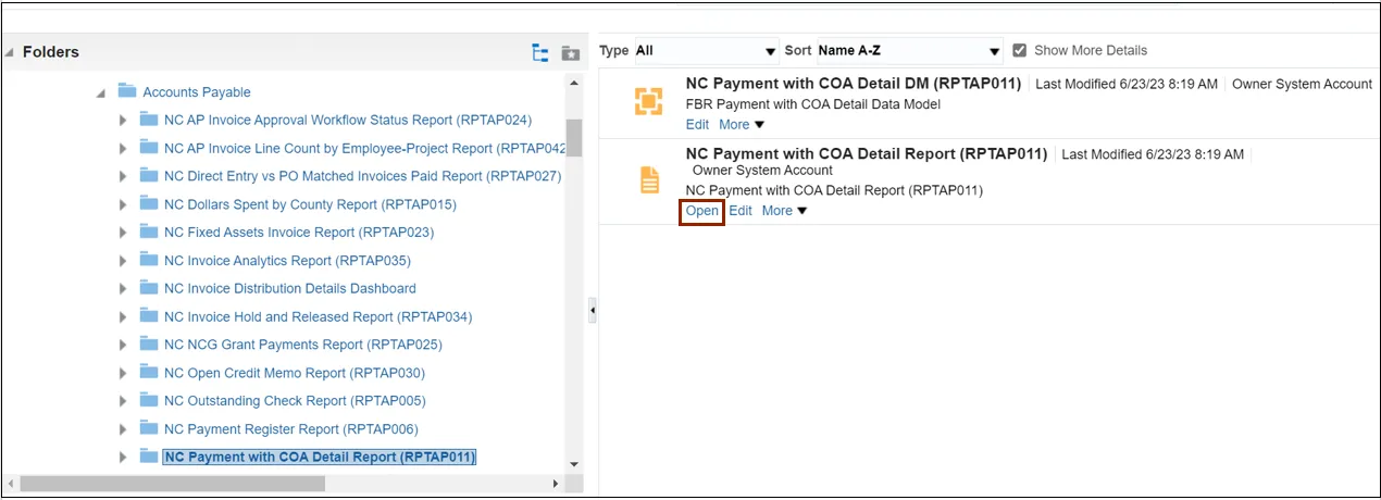 Step 5. Under the Accounts Payable tab, click the NC Payment with COA Detail Report.