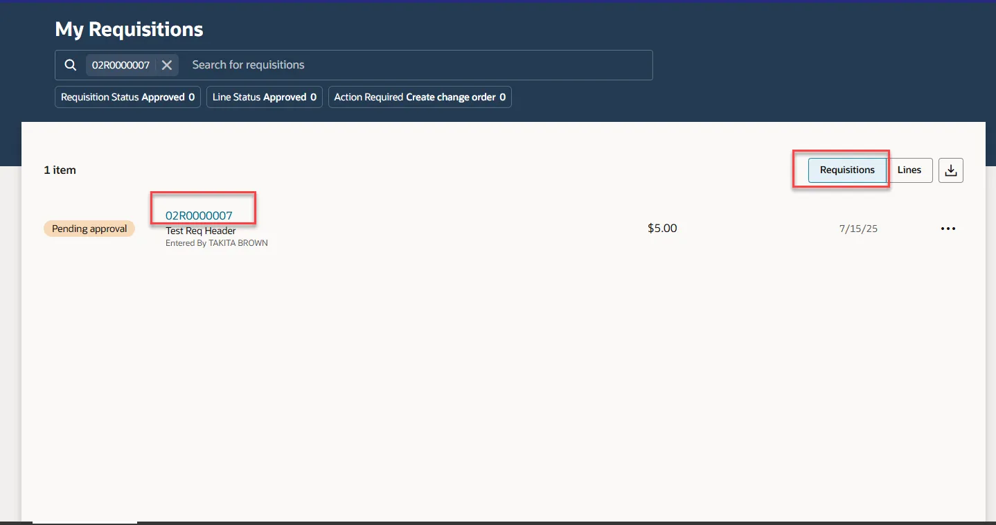 Step 5.    Select the Requisitions box in the top right and then select the Requisition number link.