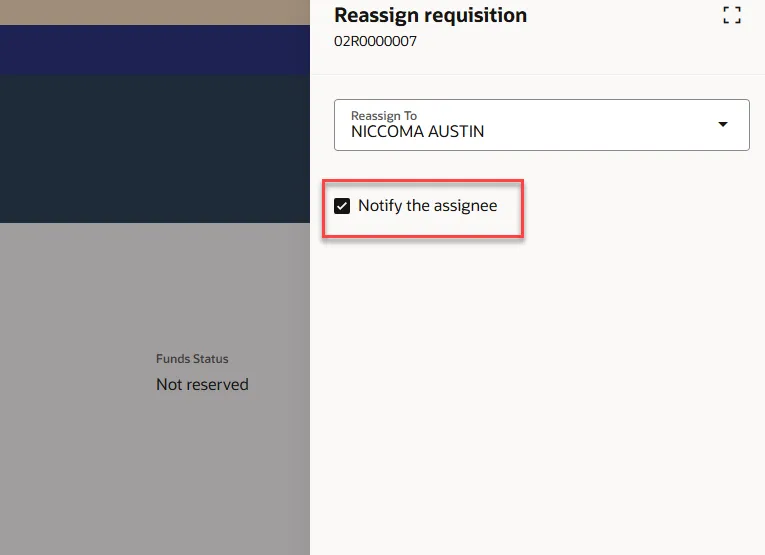Step 7.    On the Reassign Requisition pop-up, enter the name in the Reassign To field.