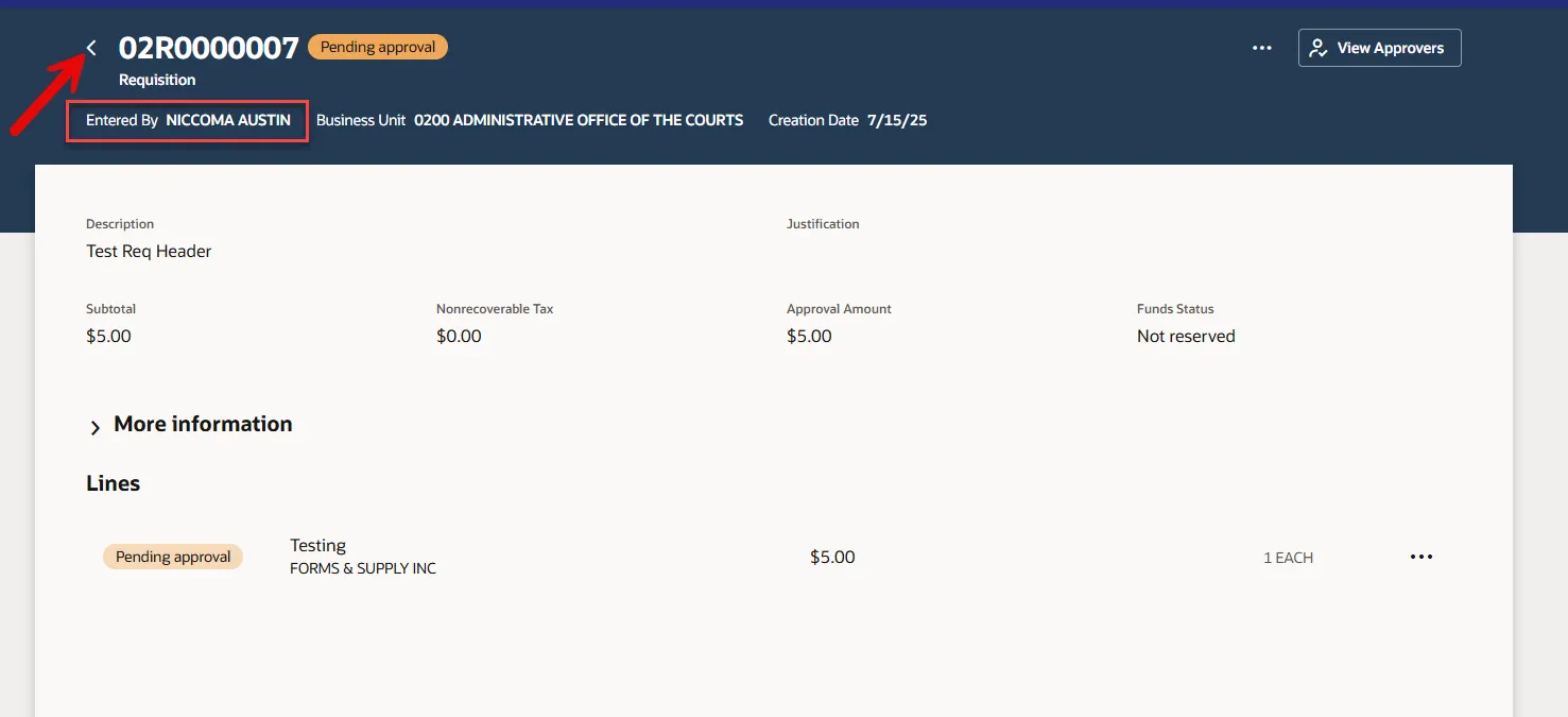 Step 10.    The Confirmation pop-up appears and goes away.  The person the requisition was assigned to is shown under Entered By.  Select the back arrow (<), beside the requisition number to return to My Requisitions dashboard.