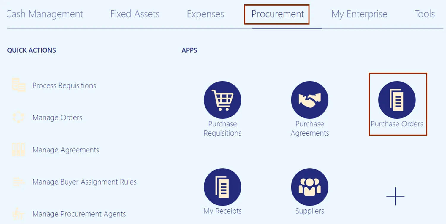 Step 2. On the Home page, click the Procurement tab. Click the Purchase Orders app.