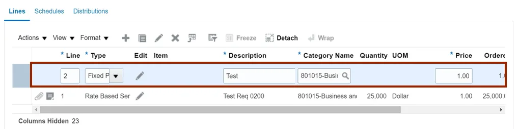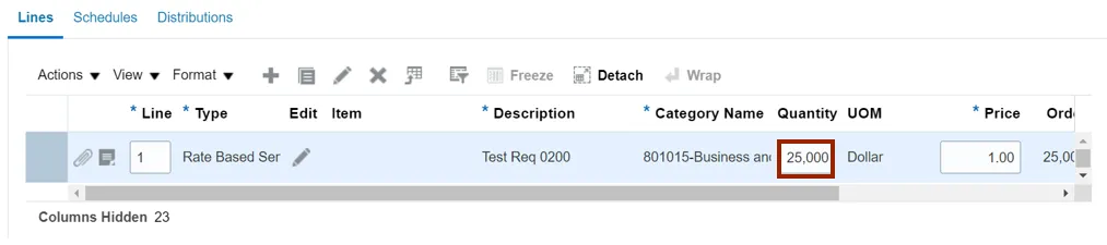 Step 7. Scroll down and validate the Lines section information. Check the Quantity, UOM, and Price fields.