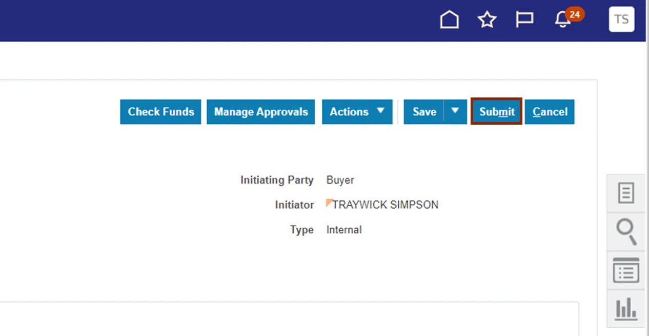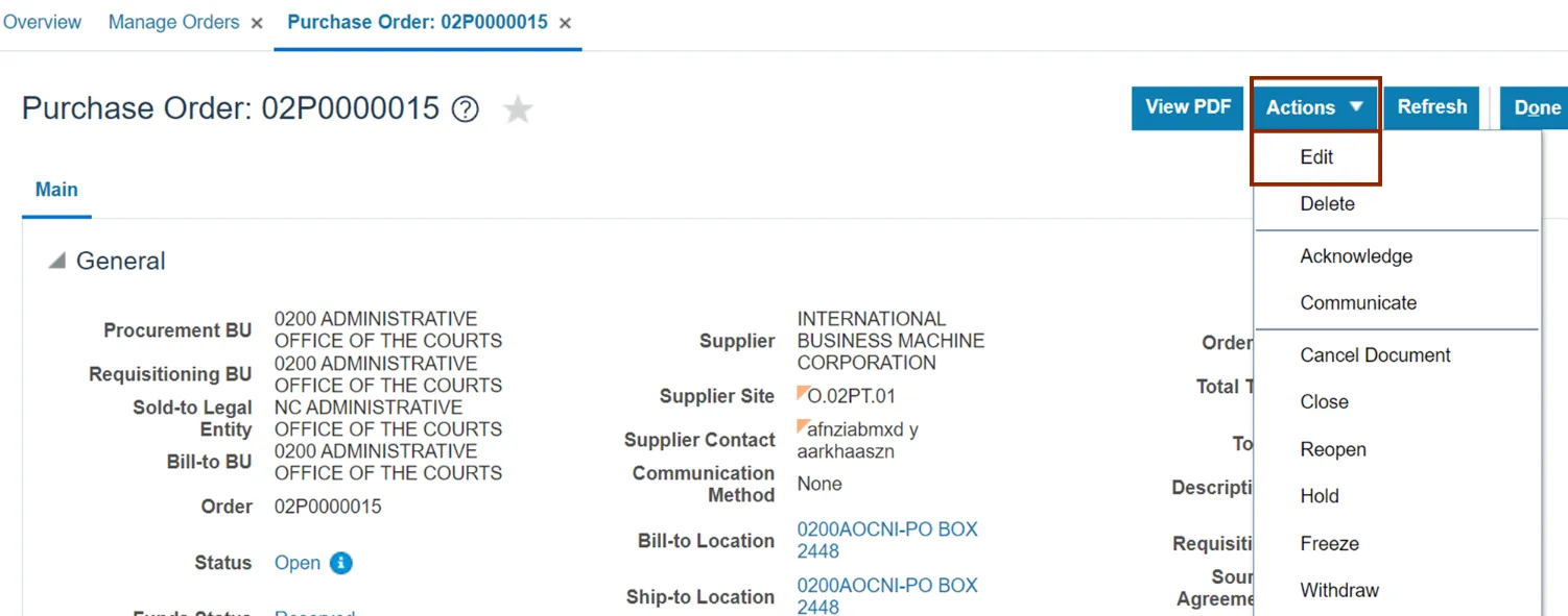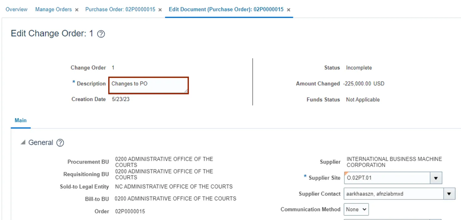 Note: If there are changes identified and required after validation of the information on the Purchase order page, please follow the steps from step 10- 15. If there are no changes required in the PO, please skip to step 15.