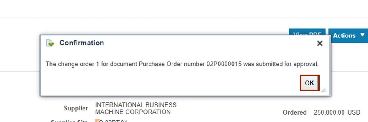 Step 16. The Confirmation pop-up appears, the changes done to PO are submitted for approval. Click the OK button.