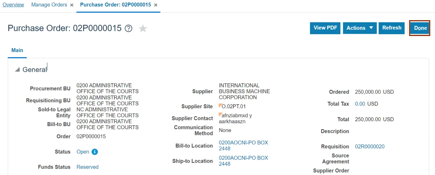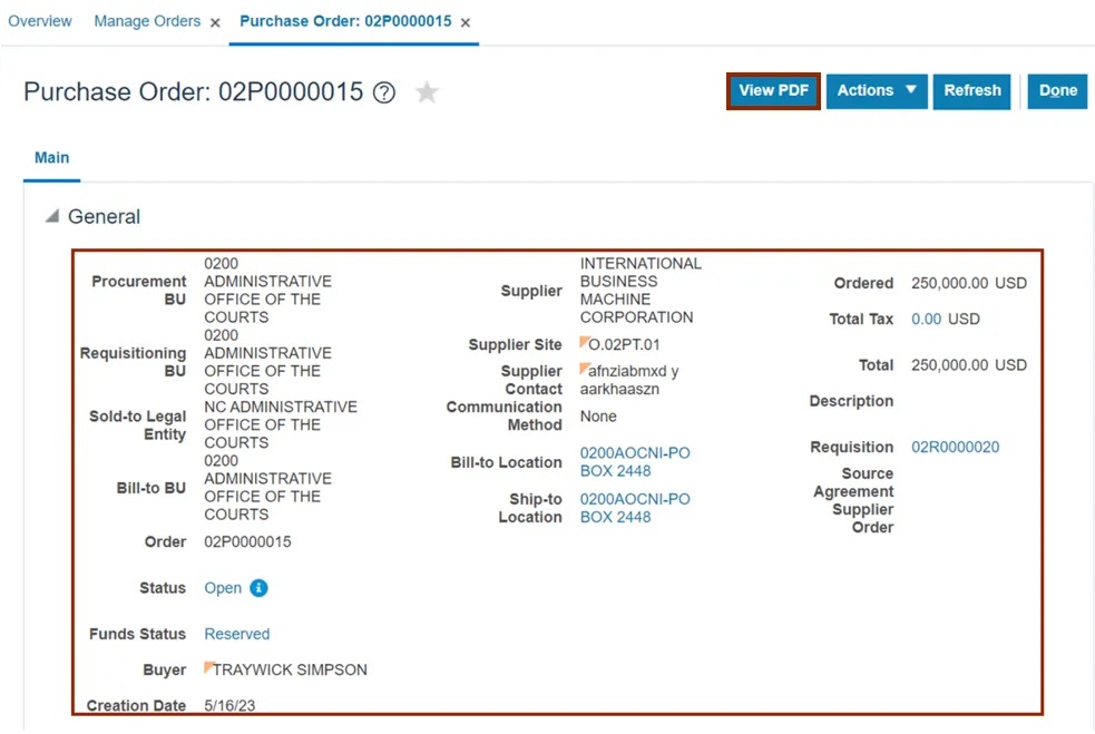 Step 6. The Purchase Orders page opens. On the General section, check the PO Status, Funds Status, Buyer, Total Amount, Description, Requisition, Supplier Name, and Supplier Site fields.