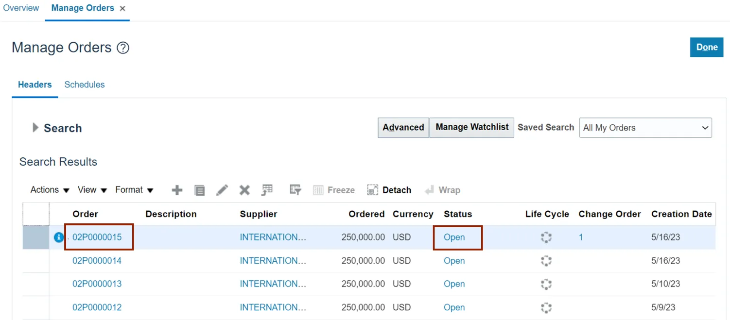 Step 5. The Manage Orders Search Results page opens. In the Search Results section, click the Purchase Order.