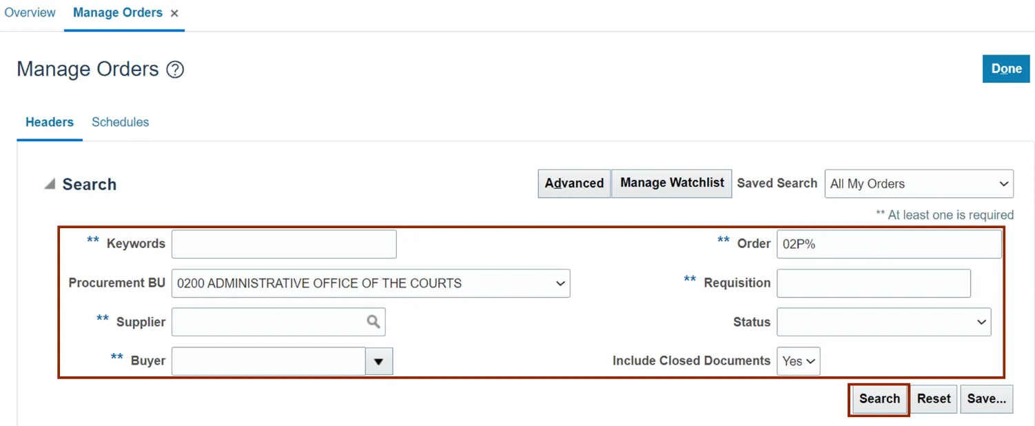 In this example, we choose Procurement BU as 0200 Administrative Office of the Courts, **Order as 02P%, and Include Closed Documents as Yes. Click the Search button.