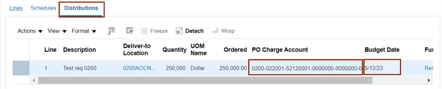 Step 9. Validate the Distributions section information. Check the Charge Account and Budget Date field.