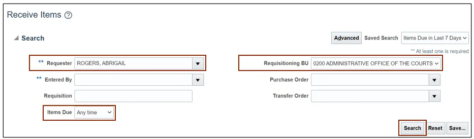 Step 4. On the Receive Items page, enter the *Requester (on behalf of whom you would like to receive), enter the Requisitioning BU and select Any Time from the Items Due drop-down choice list. Then, click the Search button.