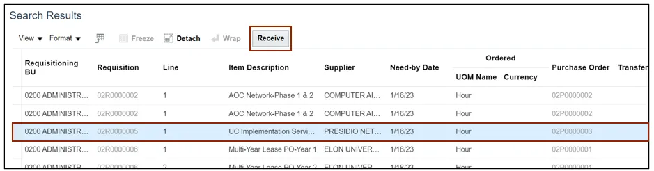 Step 5. On the Receive Items page, select the order to be received and click the Receive button.
