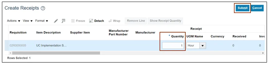 Step 6. The Create Receipts page opens. Enter the required *Quantity and click the Submit button.