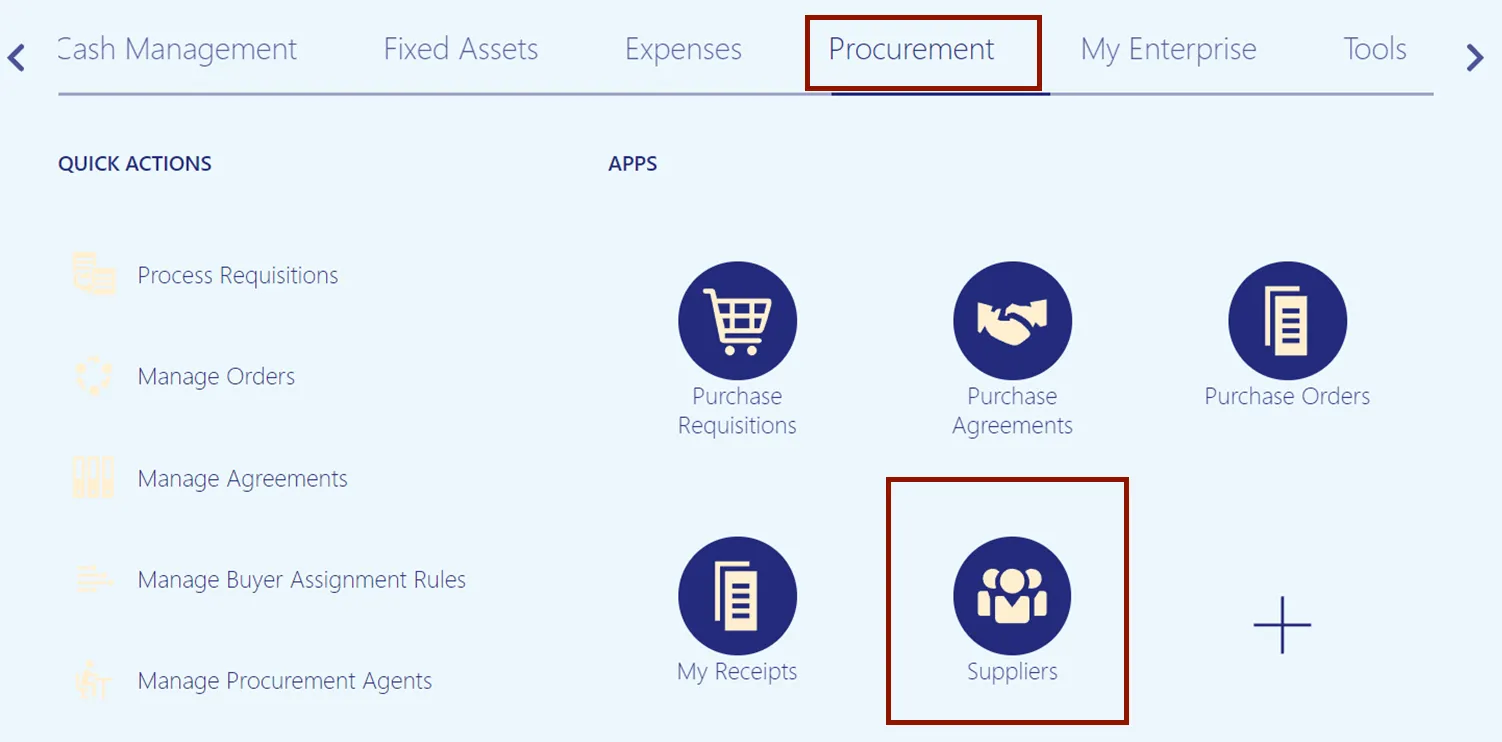 Step 2. On the Home page, click the Procurement tab, and then click the Supplier app.