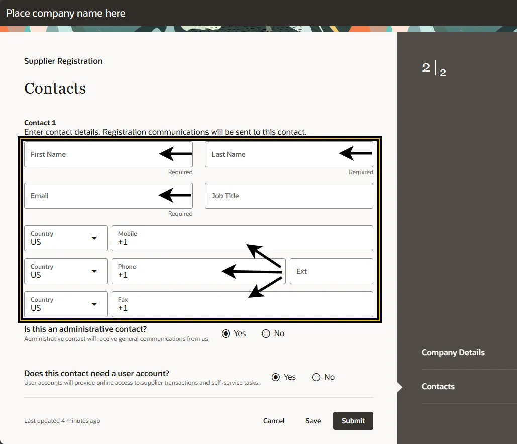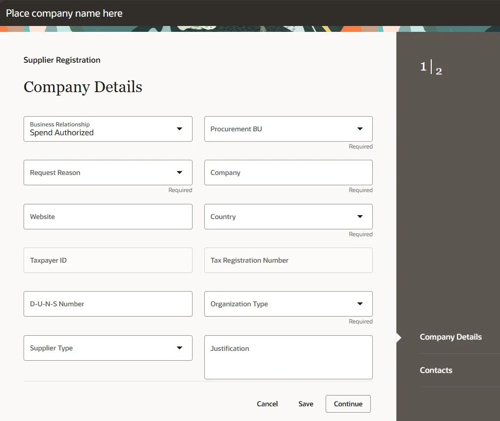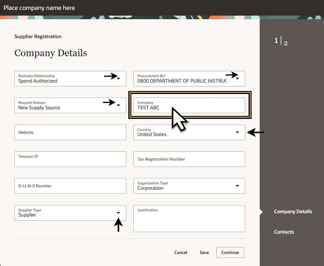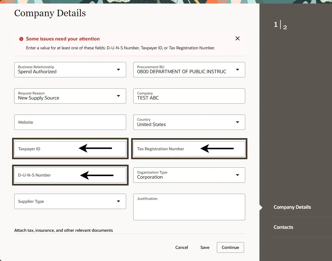 Step 6. In the Company Details section, you must enter one of the following: Taxpayer ID, Tax Registration Number, or D-U-N-S Number.