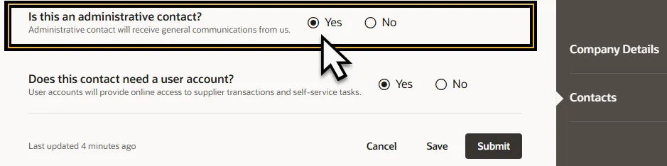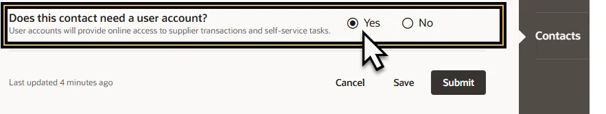 Step 14. Select if the Contact Needs a User Account. A user account provides access to supplier transactions and self-service tasks. Select Yes if the contact needs a user account, select No if the contact does not.