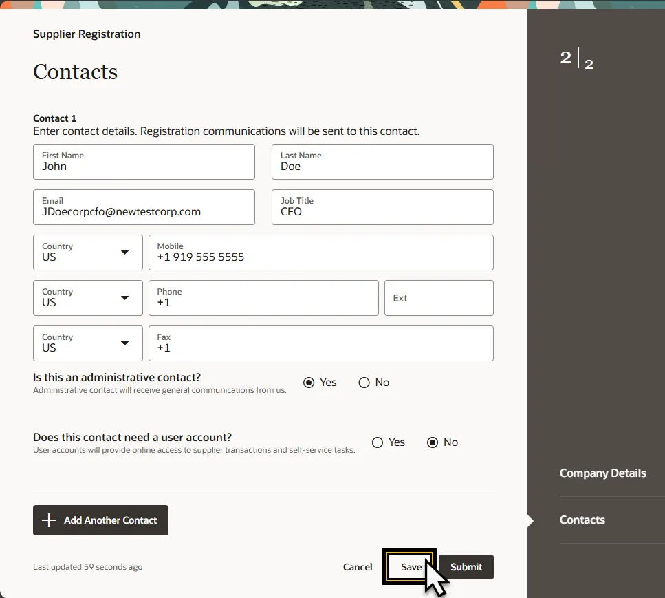 Step 12. Enter the required information into the Contacts page. The registration communications will be sent to the individual entered in the Contacts details page.