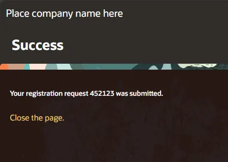 Step 17. The Success Conformation page will appear after a successful registration request providing a registration request number. Click Close the page, to return to the Supplier Dashboard.