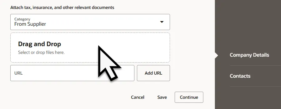 Step 8. Click the Drag and Drop field to select files to attach with the new supplier registration. Examples of documents that may be attached are Tax, Insurance, and other relevant documentation.