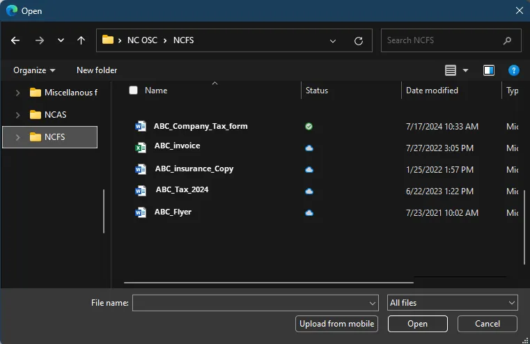 Step 9. In the file explorer navigate to the correct file location and select the files needed to upload into the Supplier Registration.