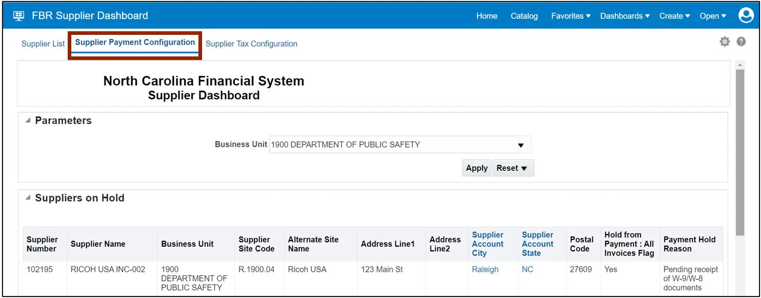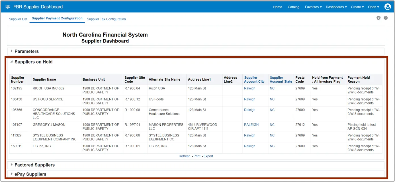 Step 13. View the Suppliers on Hold, Factored Suppliers, and ePay Suppliers reports for the filtered Agency.