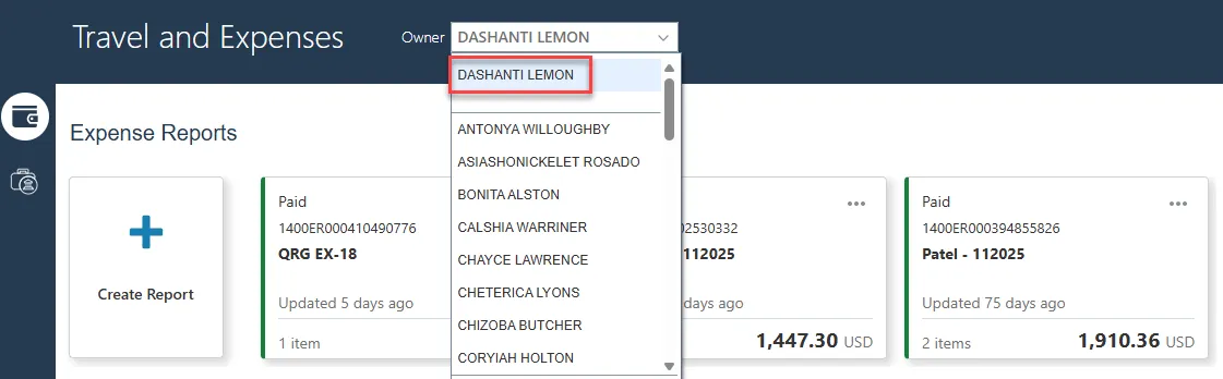 Step 17: On the Travel and Expenses page, select the Owner from the drop-down menu.  The owner is the employee for whom you need to enter the expense report.