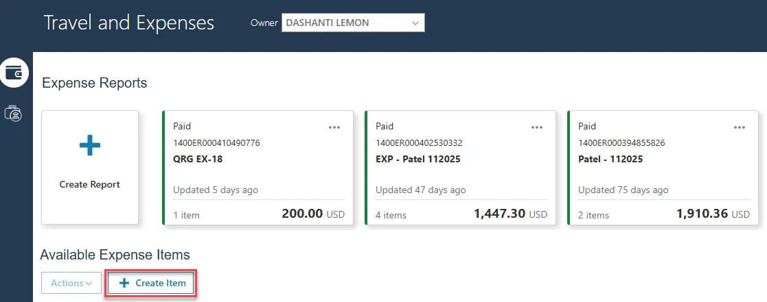 Step 21: Back on the Expense Reports page, select the expense item that was just created and click Create Report.