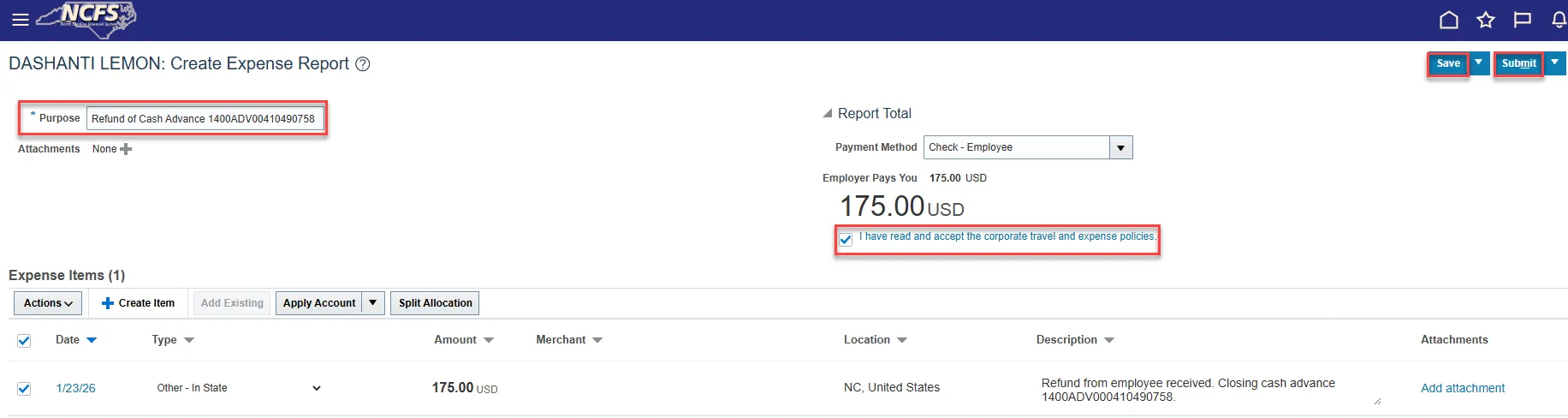 Step 23: Verify the expense report and item information is correct, then select the checkbox stating “I have read and accept the corporate travel and expense policies.”