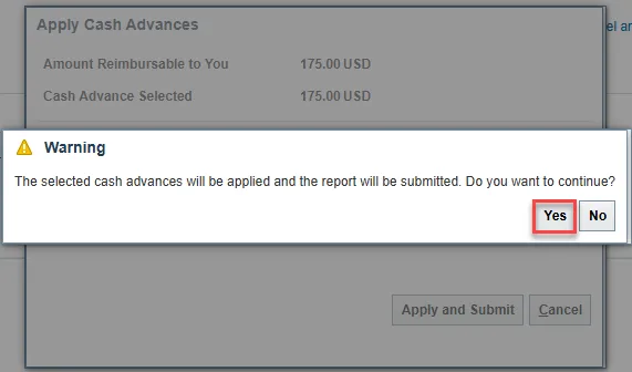 Step 27: A final pop-up box will appear stating the selected cash advances will be applied and the report will be submitted. Click Yes to continue.