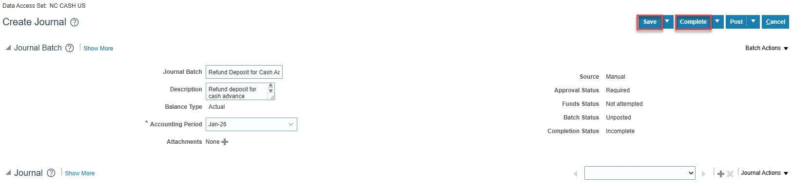 Note: A credit must be completed for the same account segment that is in the Cash Advance for the amount of the open/unapplied advance being closed.